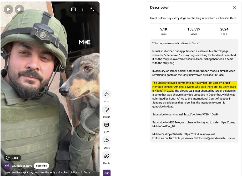 One of the videos is to a short from the YouTube account of Middle East Eye – a pro-Palestinian news service – which features a social media reel of a stray dog in Gaza and an Israel soldier saying the dog is the “only uninvolved civilian” there.